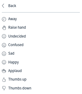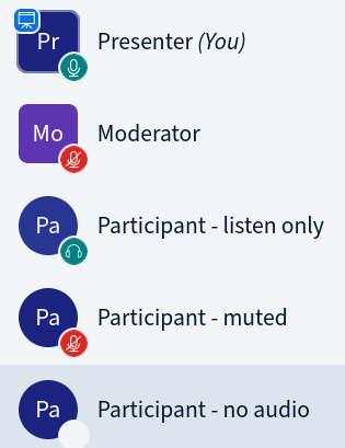 Icons will tell you more about the individual's role and their connection status. Moderators have square icons and participants circular. Presenter is only one and has a little presentation icon added. A red dot will appear for muted participants and a green one for those who are unmuted. If the icon is white, audio is not enabled yet and the user can't participate in the conversation.