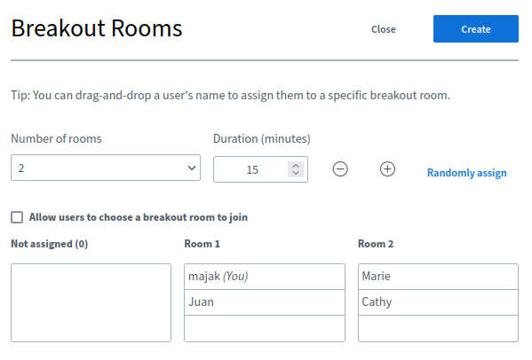 You can drag and drop the users' names, randomly assign them to rooms OR let each choose the room that they want to join. You will also need to define the duration of breakout rooms.