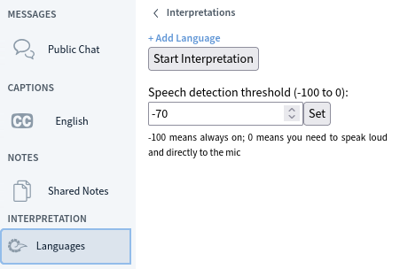 Then introduce the language names (+ Add language) and click Confirm. Define the speech detection threshold for interpreter audio input (between -100 for noisy environments to 0 which means off ): -70 is the default and you can leave it as it is.