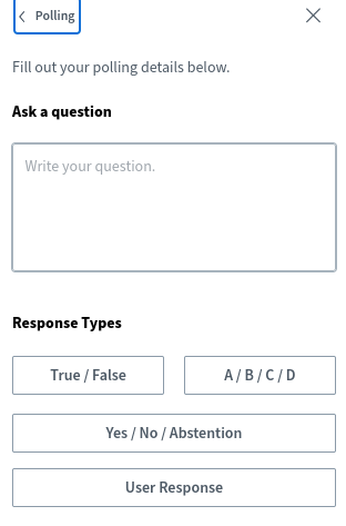 Select question type: True/False, ABCD (2 to 4 possible customizable answers), Yes/No/abstention, and open ended (each participant can fill out their answer in free text).