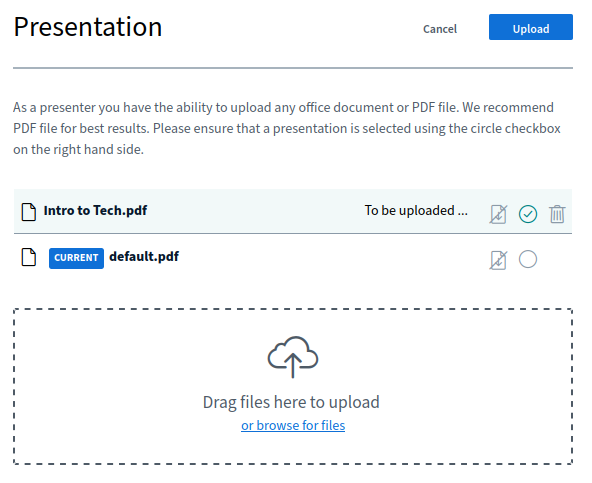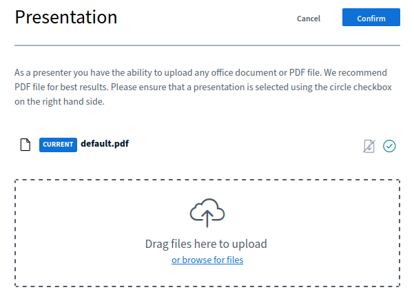 The default presentation is on the top of the list and you can add new ones by dropping them on the Drag files here to upload area or selecting them by clicking the upload area or browse for files link.