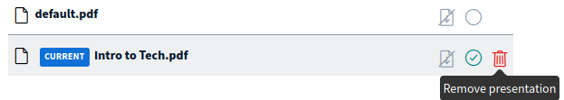 If you would like to select or upload another presentation go to blue (+) button again and select Manage presentations. The current presentation has a label CURRENT and a green circle checkbox.