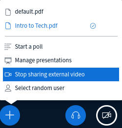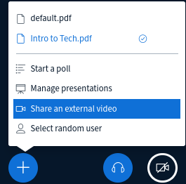 To share an external video (videos available on Vimeo, YouTube, Twitch...) you need to have a presenter role, then click on the Plus (+) button and select Share an external video in the menu.